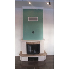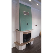Предтопочная и надтопочная часть выложена шамотом песочно-жёлтого цвета. Каминная балка изготовленная из МДФ и покрытая шпоном дуба, послужит отличной полкой для каминных аксессуаров, таких как часы, канделябры, рамки с фотографиями и др.